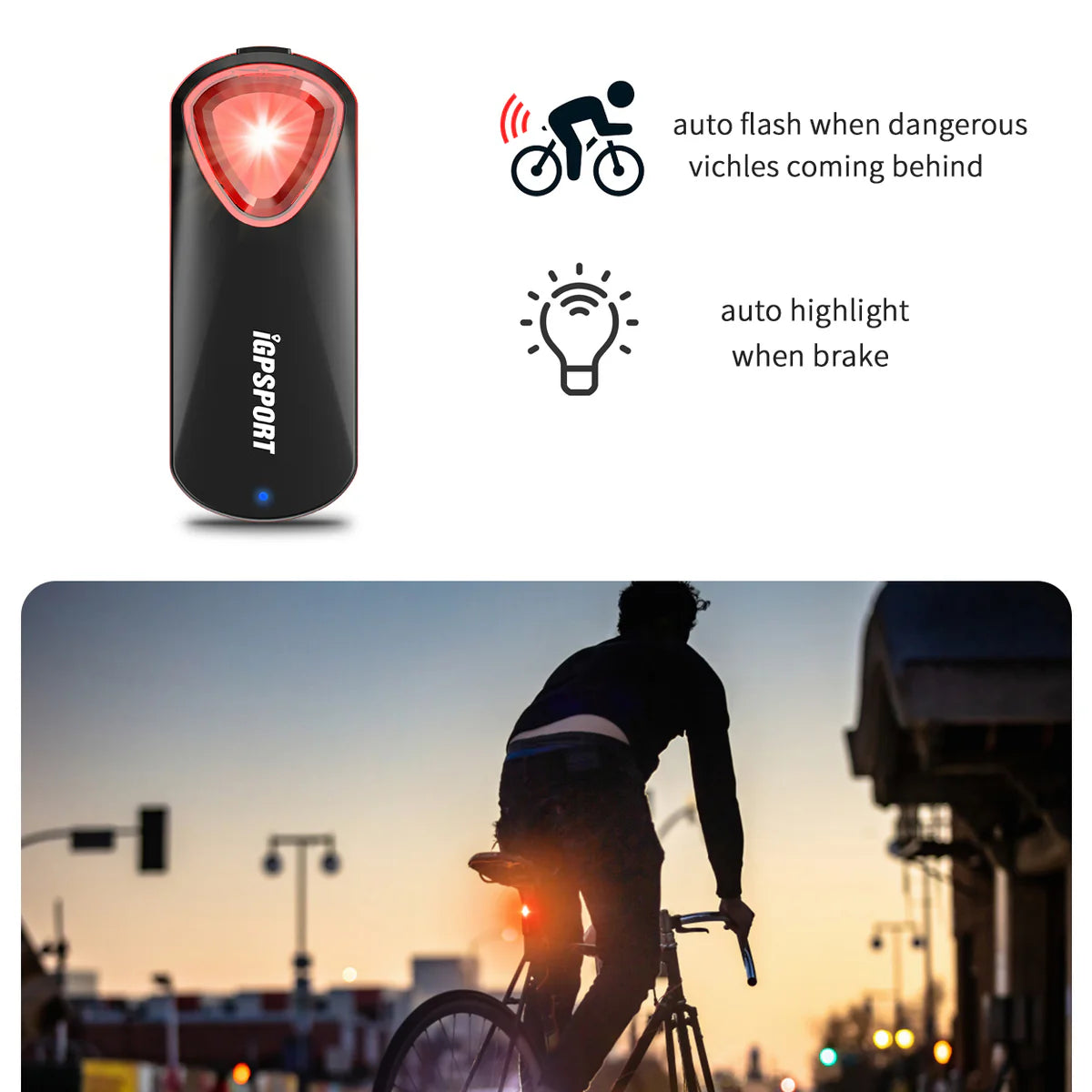 • Connectivity: Compatible with cycling computers, watches or devices that support standard protocols (BLE / ANT+), as well as the official iGPSPORT app for radar notifications, battery status, etc.