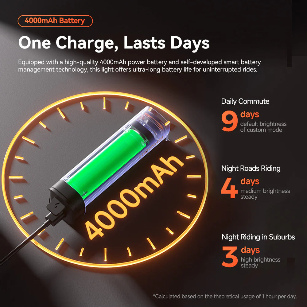 4000 mAh rechargeable battery with USB-C fast charging, extended autonomy and accurate battery level prediction visible in the app or cycle computer.